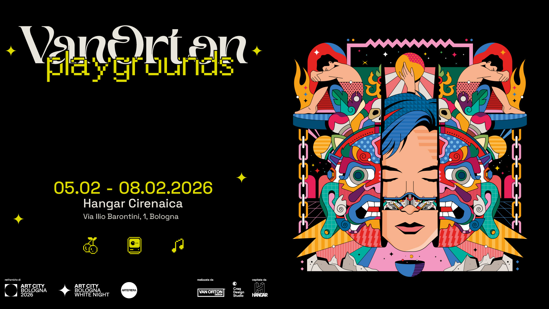 Dal 5 all’8 febbraio 2026, l’Hangar Cirenaica di Craq Design Studio si trasforma in un gigantesco playground visivo. In occasione di ART CITY Bologna e Arte Fiera, ospitiamo “Van Orton: Playgrounds“, un viaggio immersivo nell’universo colorato e inconfondibile del duo torinese.
